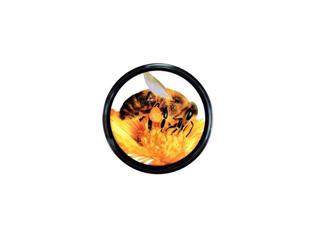 Viečko na fľaše na med kovové žlto-čierne so včelou na kvete